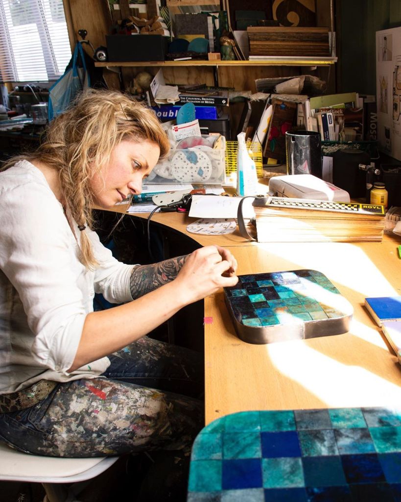 Using scientific theories on the interplay between humans and colours, Sanne composes individual squares into larger images that capture a moment in time. Colours and textures are her driving force and her main inspiration. Drawing upon her materials, her process becomes more than a vehicle to get to the end result. It’s part of that end result – a story frozen in a polished layer of resin. Sanne’s work isn’t made to provoke but to evoke. Evoke a faint sense of familiarity. A forgotten moment. A whiff of emotion. While creating, her method is one of intuitive precision. A duality that lets her be guided by her gut feeling while using exact chemical processes and laborious historical pigments to manipulate pieces of metal and scraps of canvas. As her work heavily relies on natural oxidation, time isn’t just Sanne’s to defy – it’s also her greatest ally. It’s this somewhat repetitive method that kindles the calm in a usually quite restless spirit.